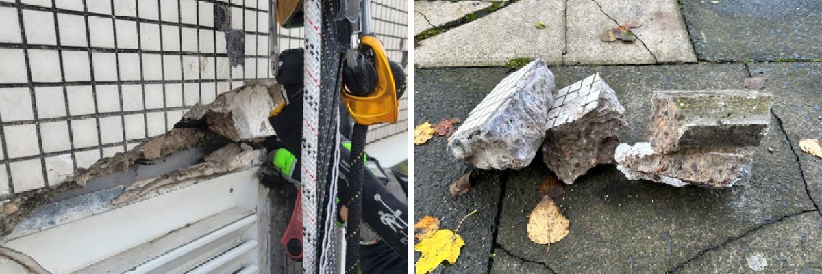This is the reason why regular condition surveys should be undertaken; we have been carrying out condition safety surveys and defect surveys using rope access methods for 24 years.